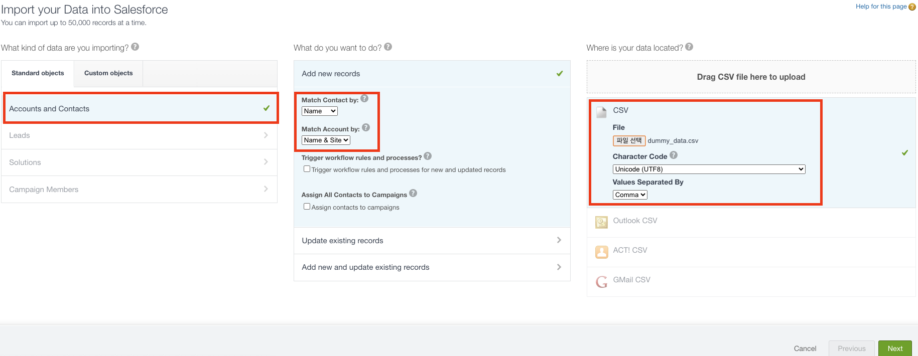 2. Match Contact by / Match Account by 값 선택: 데이터 넣을때 중복 체크하는 기준